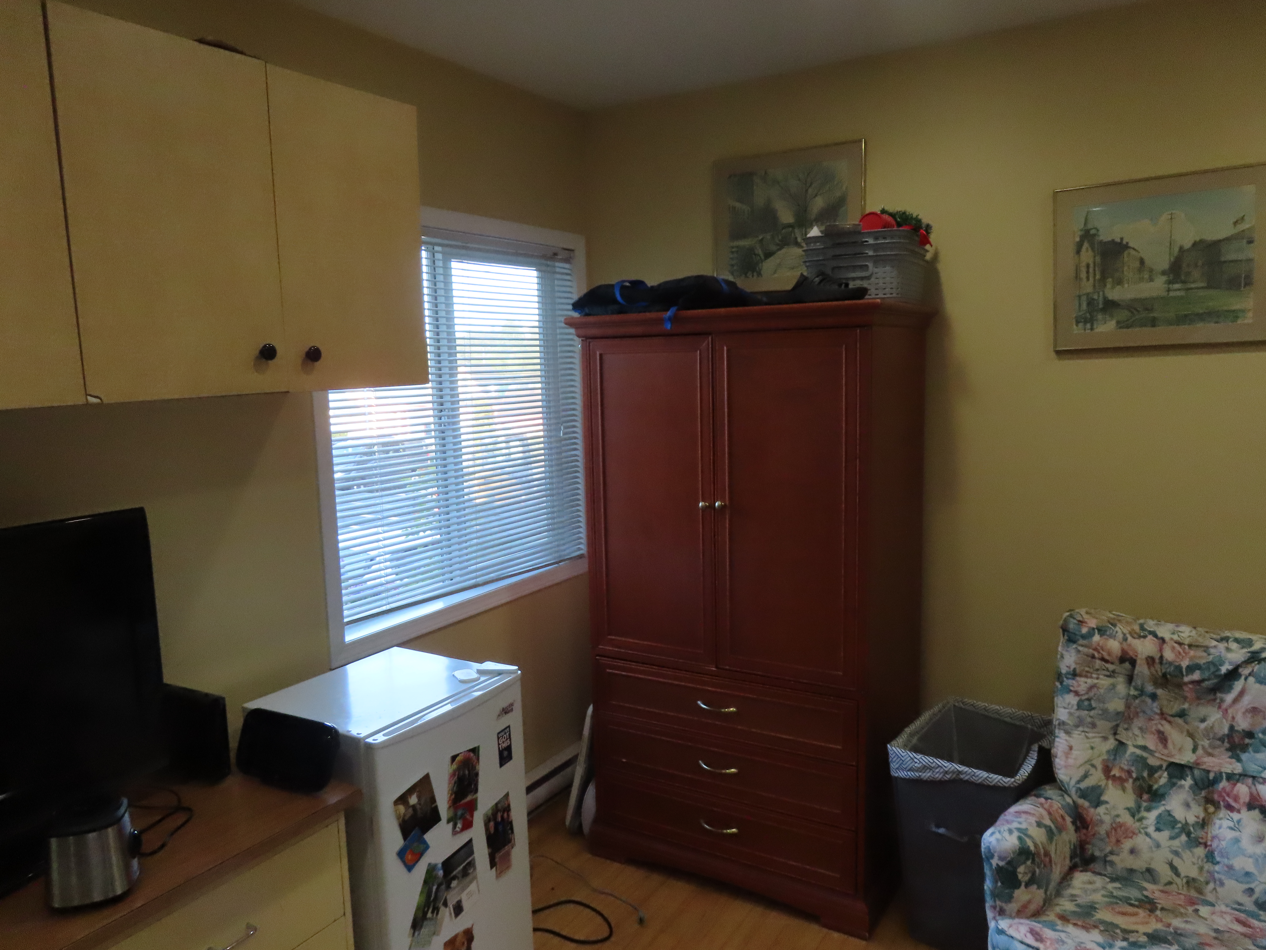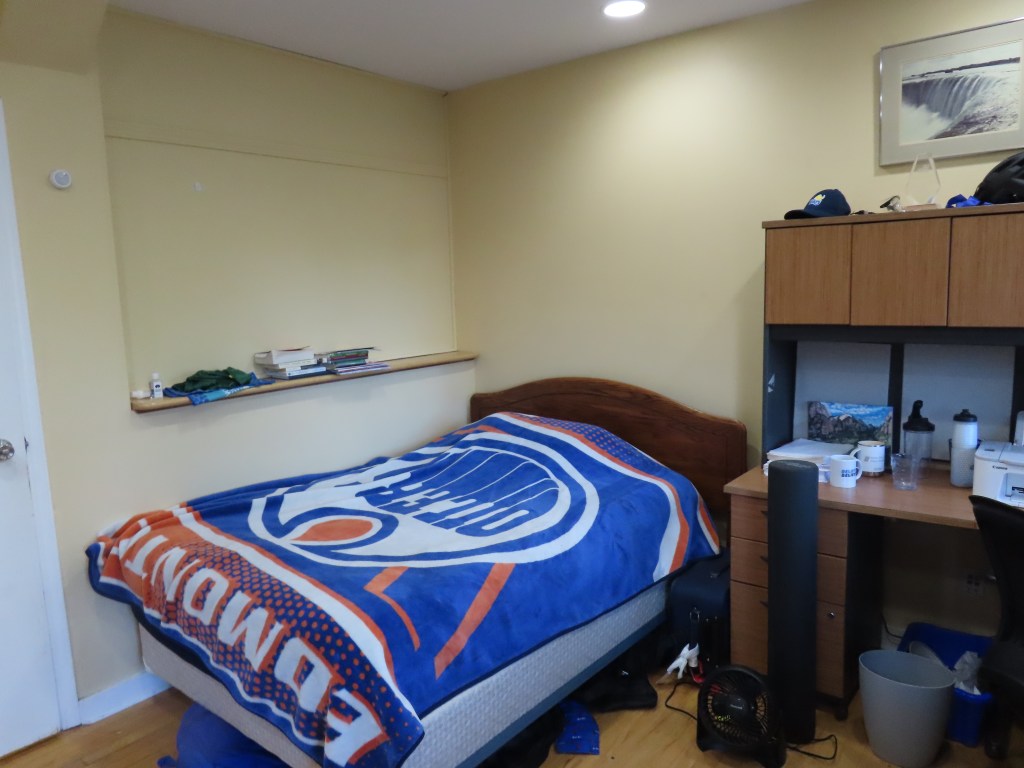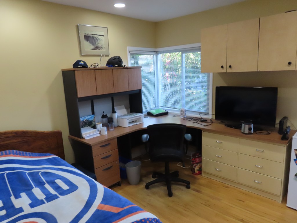 Room 5 is on the main floor at the front of the house. It is large (12′ by 16′) and bright and fully furnished. All utilities including wifi are included in the rent.